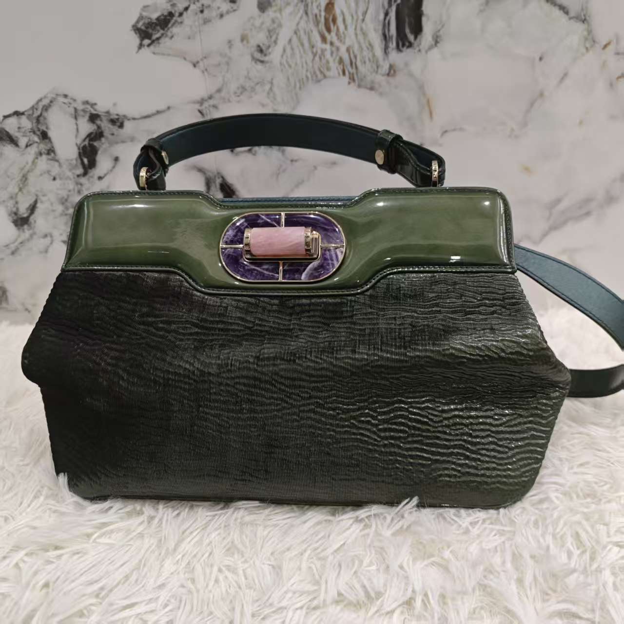 This Bvlgari handbag showcases a rich green hue, combining iconic luxury with a distinctive color that elevates any ensemble. Crafted with precision, it offers both style and subtle sophistication, making it an expert choice for those seeking a statement accessory with timeless appeal.