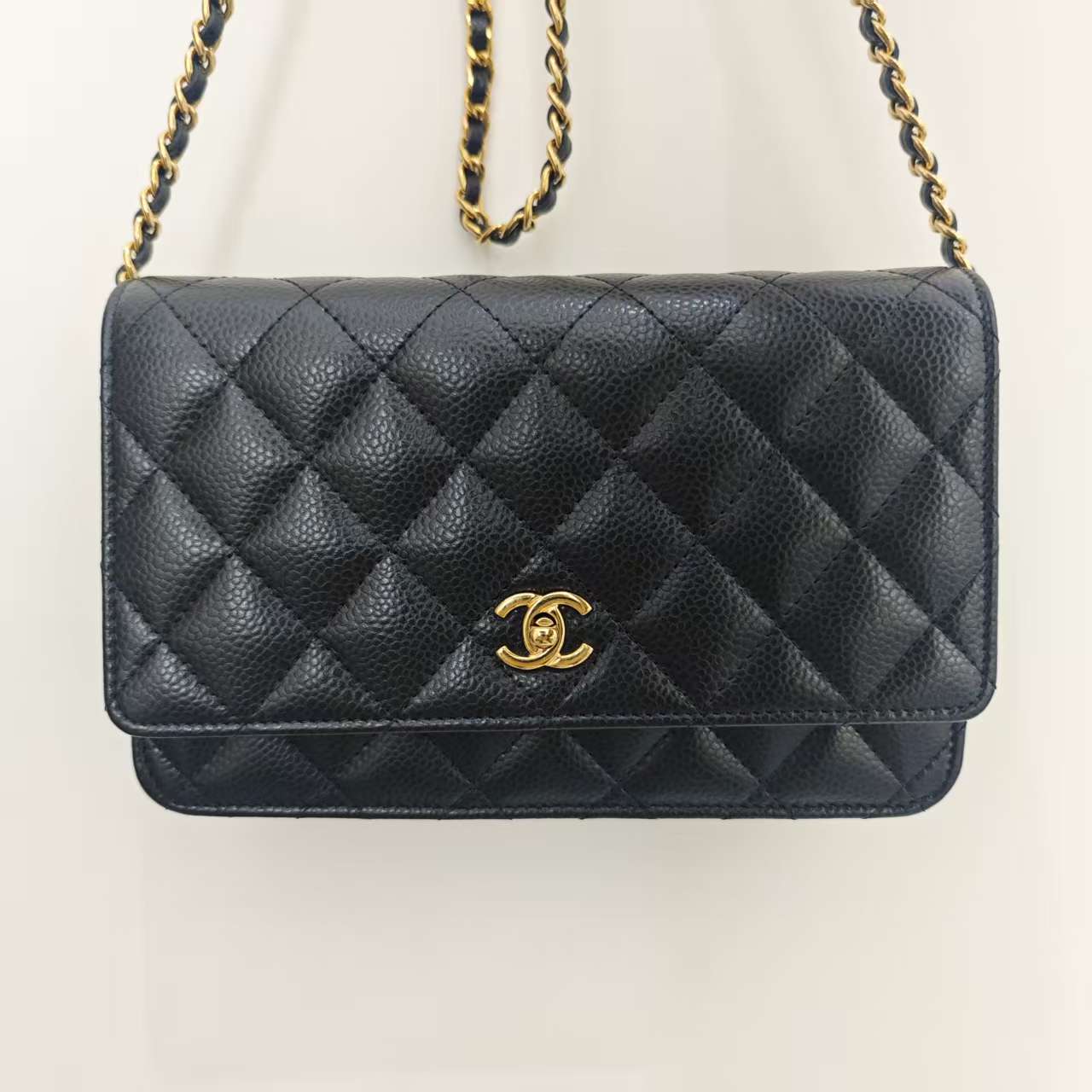 The Chanel black Wallet on Chain (WOC) is a timeless accessory that blends elegance with practical design. Crafted from premium black leather, it features refined stitching and the iconic CC logo, providing a sophisticated touch to any ensemble. Its compact size offers organized compartments for essentials like cards, cash, and phone, making it perfect for day-to-night use. Durable and versatile, this WOC complements a variety of styles while offering effortless hands-free convenience. An investment in enduring luxury and functionality.