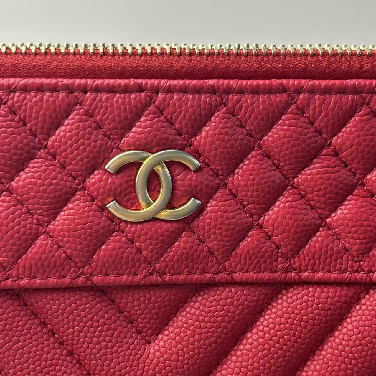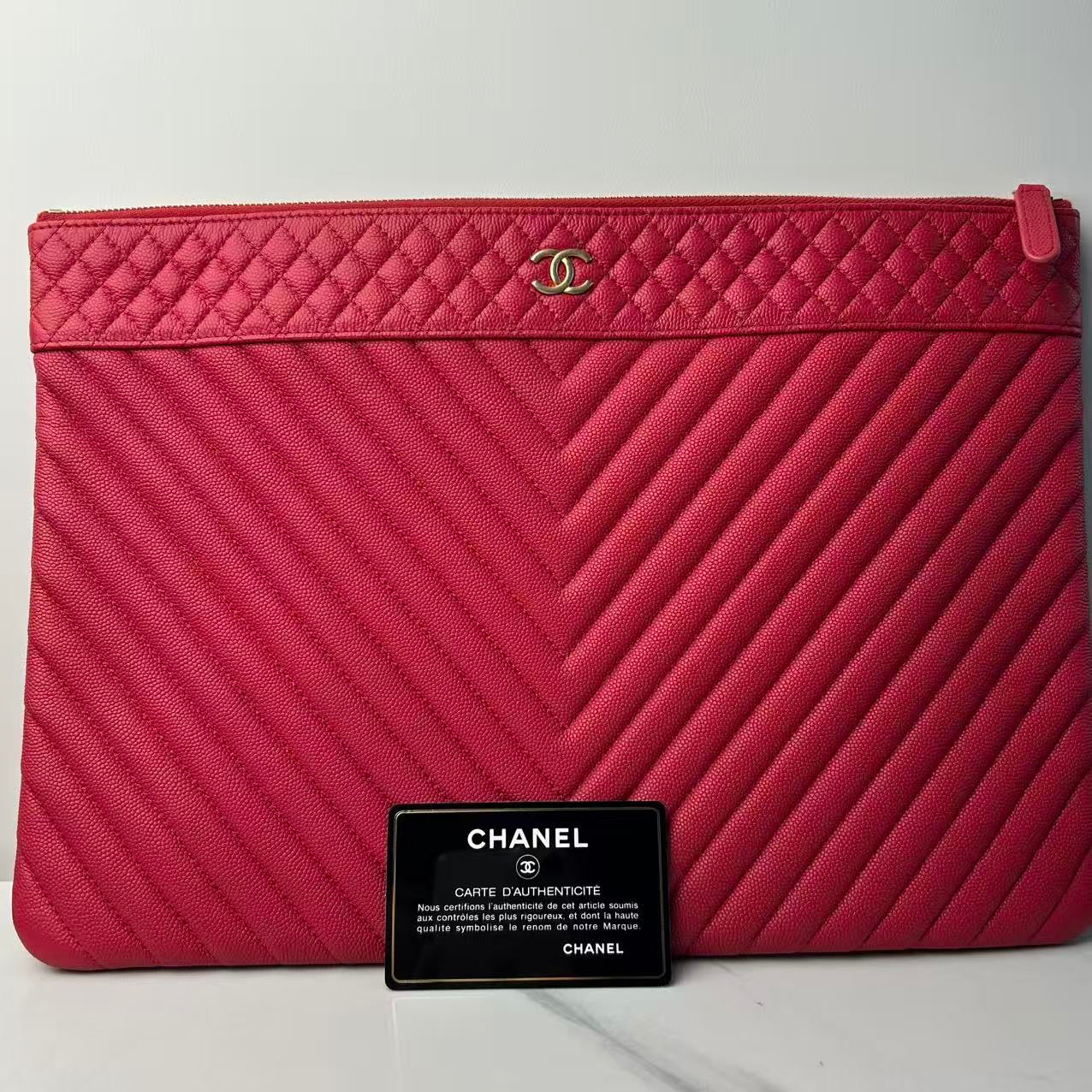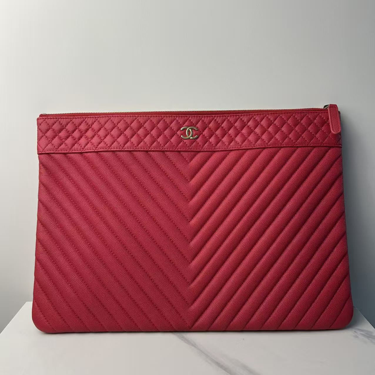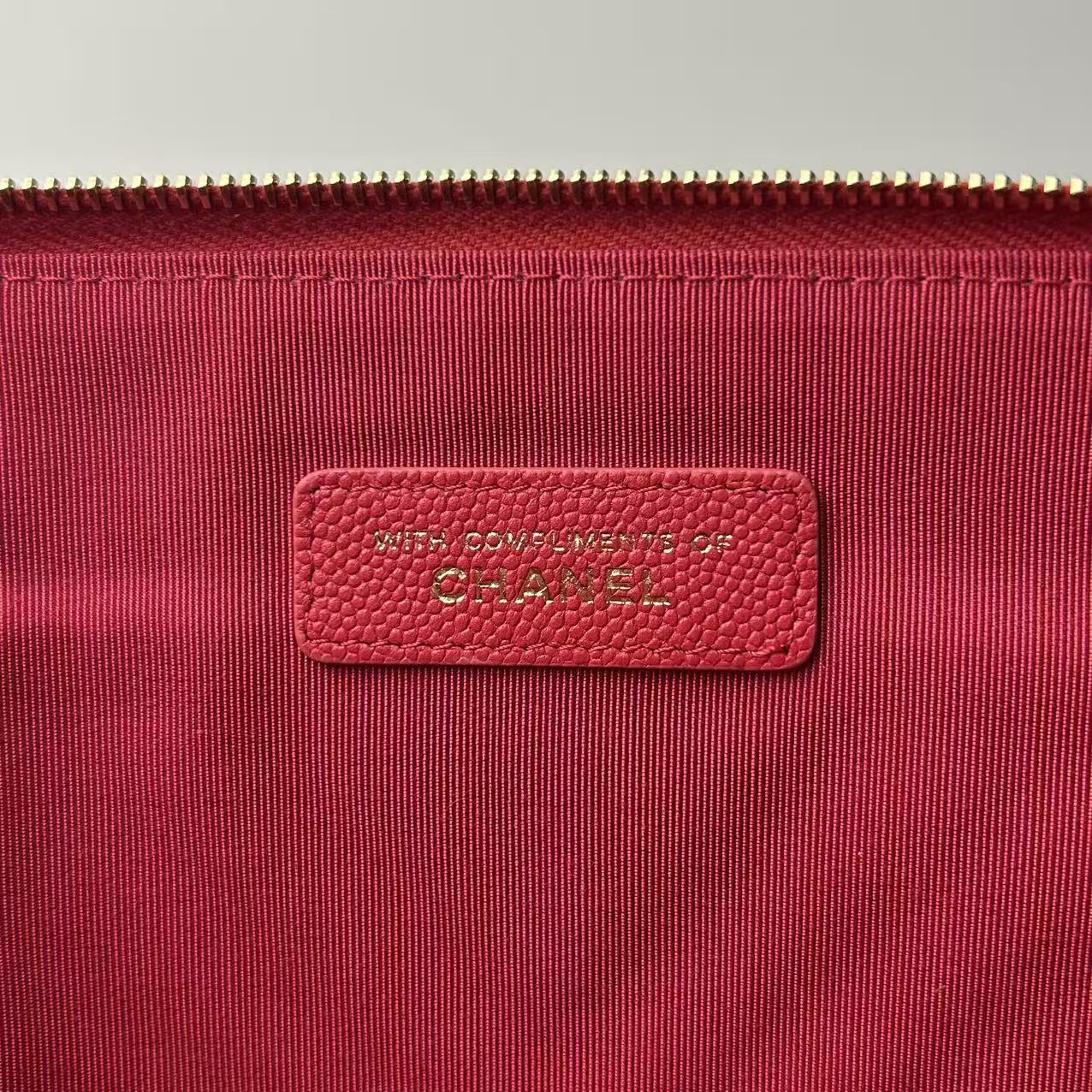 CHANEL Caviar Chevron Quilted Large Cosmetic Case in Red. This chic cosmetic case is crafted of chevron quilted caviar leather in red with a small Chanel CC logo in light gold on the front. The top zipper opens to a spacious red fabric lining.