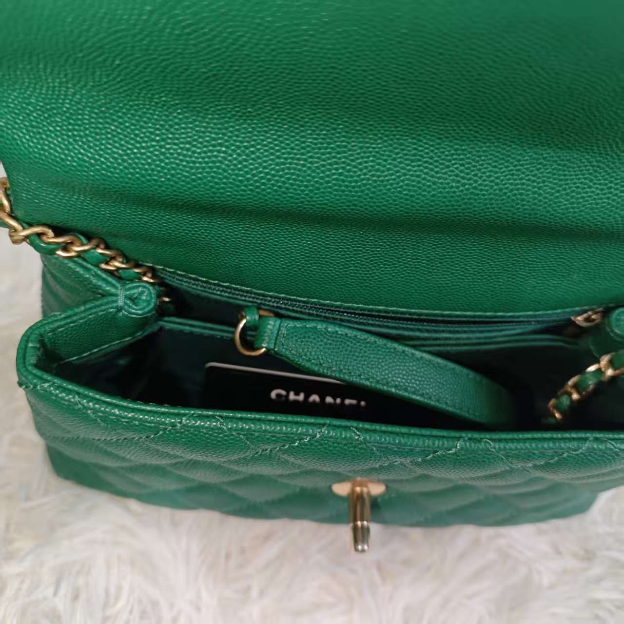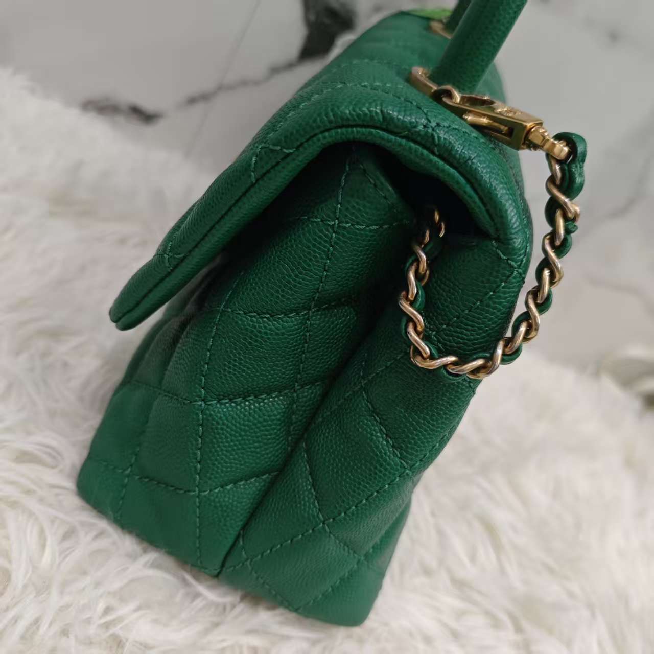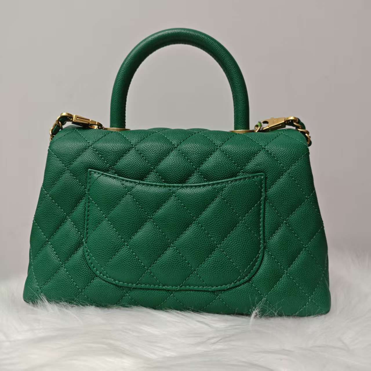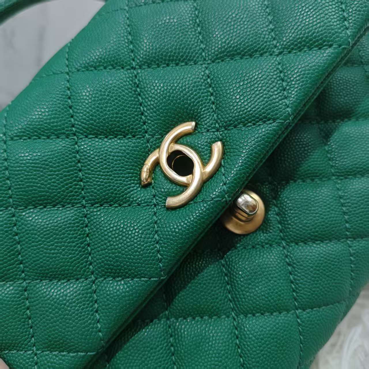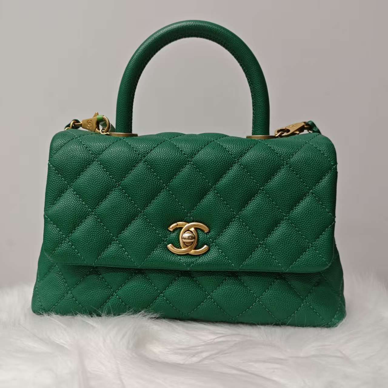 Crafted from premium cowhide, the Chanel Coco Handle leather handbag in striking green combines timeless elegance with durable construction. Its structured silhouette and top handle provide a sophisticated way to carry essentials, while the high-quality material ensures longevity and a refined patina with use. Ideal for those seeking a statement piece that balances classic design with everyday practicality.
