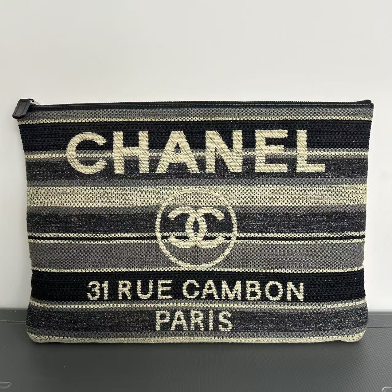 CHANEL Striped Canvas Large Deauville Pouch Clutch Black