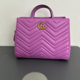 This Gucci bag showcases a rich purple hue, combining the brand’s iconic luxury with a striking color. Crafted with attention to detail, it offers both style and sophistication, making it a versatile accessory for those seeking a bold yet elegant statement piece. The deep purple color enhances its exclusivity while complementing a wide range of outfits.
